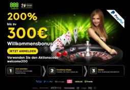 Als eines der ältesten und größten Online Casinos ist der Willkommensbonus bei 888 Casino natürlich mehr als nur gut. Neben dem exklusiven Casino Bonus, den Sie ausschließlich bei uns erhalten, gibt es noch drei weitere: Ein Willkommensbonus, ein Willkommenspaket und ein Bonus ohne Einzahlung!